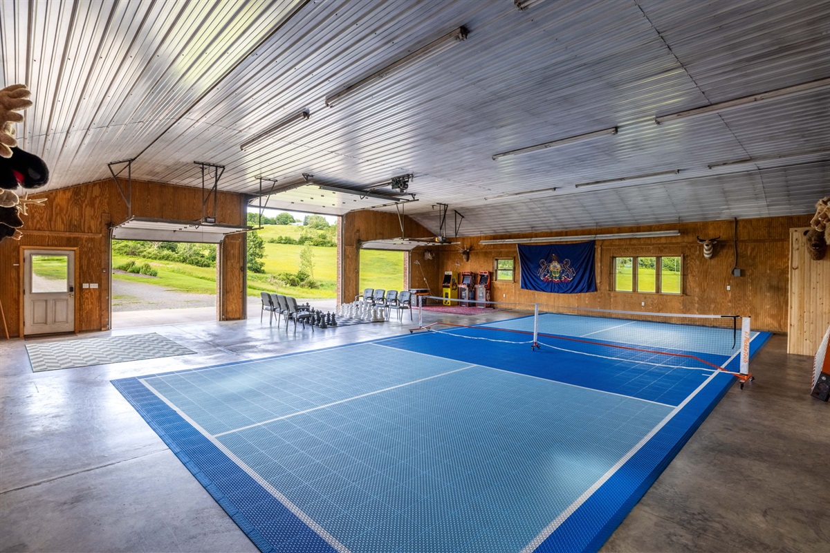 GARAGE GAME ROOM: Indoor regulation pickleball court, Gym, life size chess, arcade games